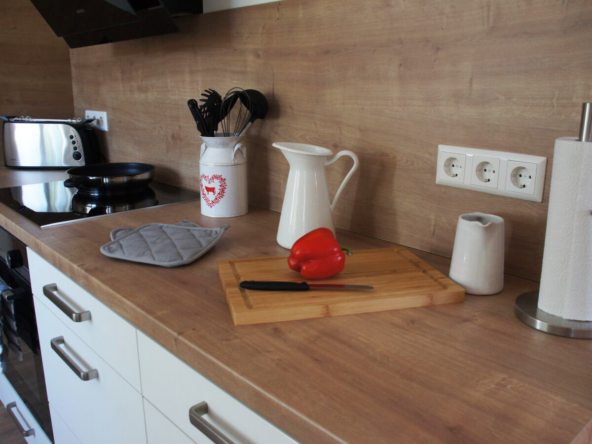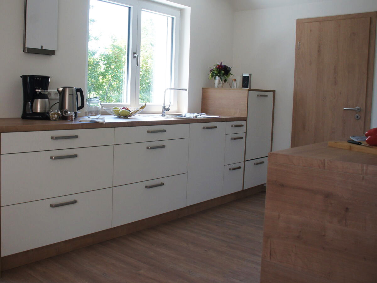 - Die EBK ist mit Backofen, 4 Plattenherd, Kühlschrank mit Gefrierfach, Kaffeemaschine, Toaster, Wasserkocher, Mikrowelle und ausreichend Geschirr ausgestattet.