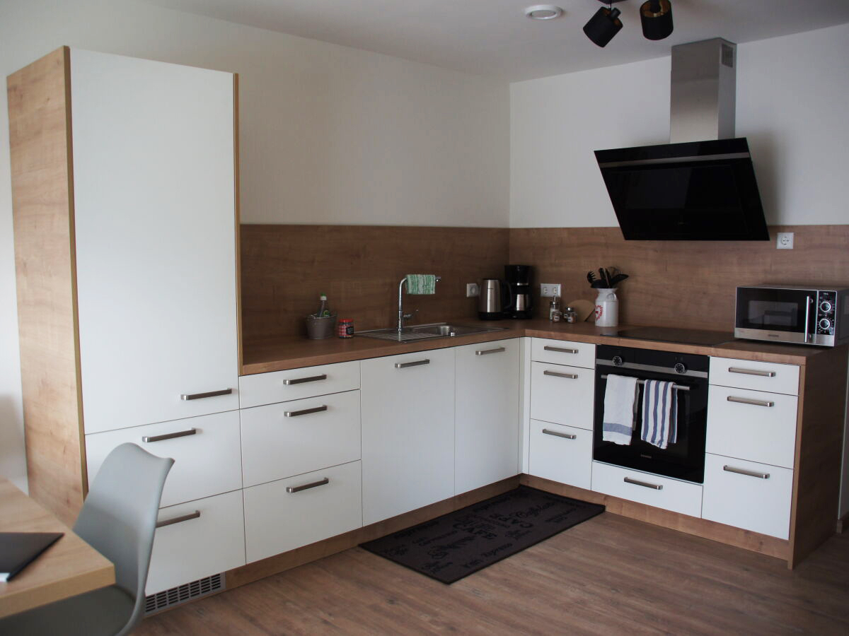 - Die EBK ist mit Backofen, 4 Plattenherd, Kühlschrank mit Gefrierfach, Kaffeemaschine, Toaster, Wasserkocher, Mikrowelle und ausreichend Geschirr ausgestattet.
